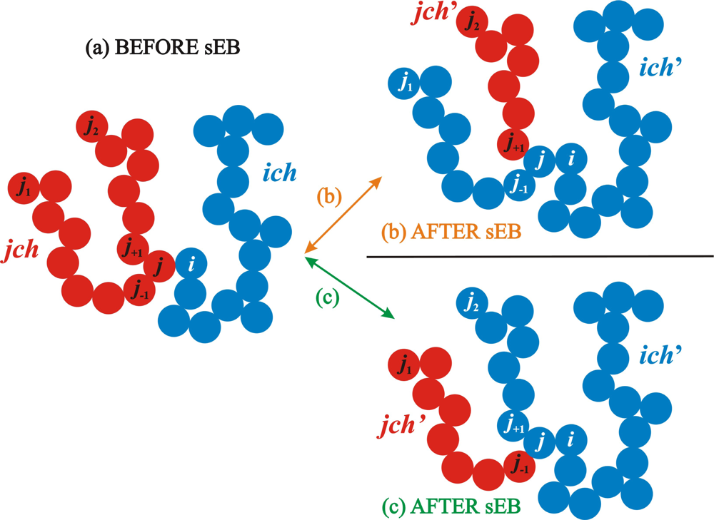 Both moves commence by selecting randomly one of the pairs included in their special lists. If an sEB (or sIEB) is attempted and its list of initiators is empty then the move is automatically rejected. For sEB if both combinations (b) and (c) are permitted then one is randomly picked. In the reverse transition (new → old) the (sEB or sIEB) neighbors of the new temporary chain end are counted since their number enters into the weighting factor of the reverse transition (Equations 4 and 6). Finally, the move is accepted or rejected according to the corresponding acceptance criterion, Equations 3 and 5 for sEB and sIEB, respectively. In case of acceptance of an sEB move, because of the major alternations in chain connectivities, the sEB-related lists are calculated from scratch for all chains in the system, while the ones of sIEB are computed only for ich and jch. In an analogous fashion, after an accepted sIEB move the sEB-related lists are re-calculated for all molecules but the sIEB-related ones are updated only for chain ich.