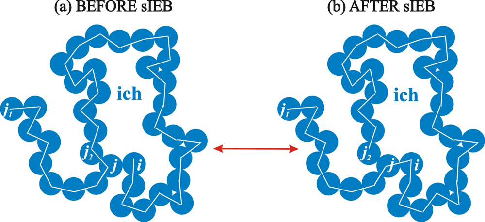 The simplified intramolecular end-bridging (sIEB) move, by being the intramolecular variant of the sEB algorithm, is executed in a very similar fashion, the only difference being that all alternations occur in a single chain. The schematic representation of sIEB is depicted in Figure 3. Chain ich consists of the original sequence of spheres (j1, ..., i). If chain-end i and internal site j lie within the bonded distance of σ + dσ (i.e., they are tangent within the specified numerical tolerance of bond lengths) an sIEB move can be initiated. For any given pair of intramolecular pairs sIEB proceeds in a single pattern: the bond between sites j and j2 breaks and a new one is formed between i and j. As a result the sequence of spheres in ich changes to (j1, ..., j2) (as seen in Figure 3) and sphere j2 becomes the new terminal site of chain ich.