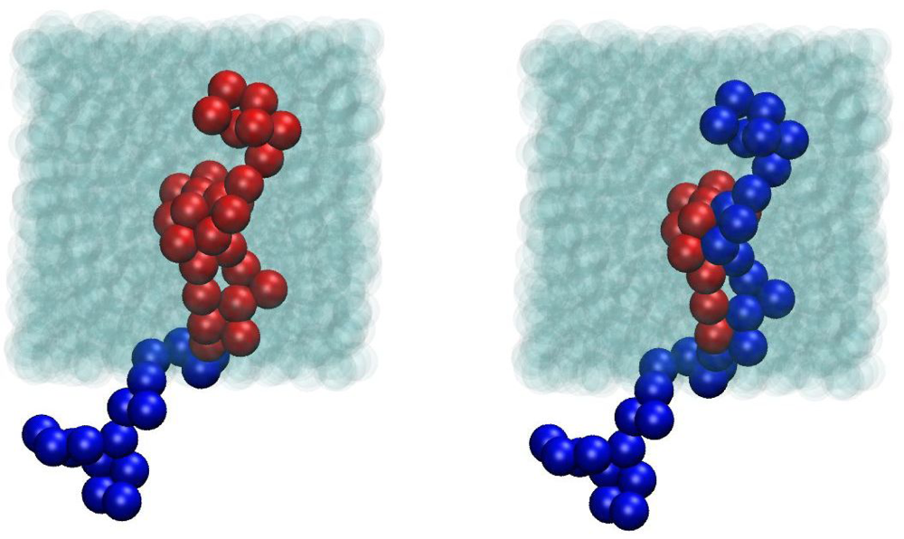 Representation of the two participating chains before (left) and after (right) the successful application of a simplified end-bridging (sEB) move from MC simulations on a N = 24 system at packing density φ = 0.63. Constituent spheres are shown with the coordinates of the centers fully unwrapped in space. Image created with the VMD visualization software [].