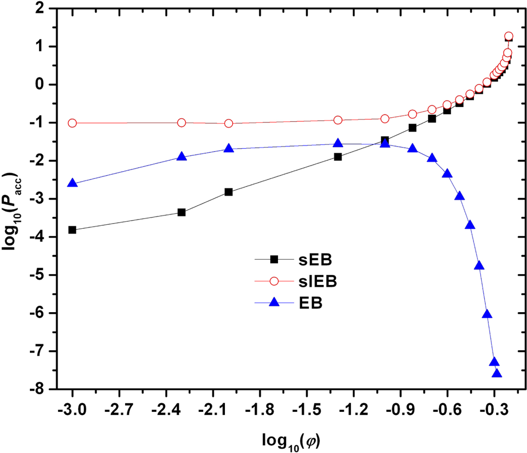 Logarithm of the percentage acceptance rates, log10(Pacc) for the simplified end-bridging (sEB), simplified intramolecular end-bridging (sIEB) and of the original end-bridging (EB) moves as a function of the logarithm of packing density, log10(φ) as obtained from MC simulations on a ⟨N⟩ = 500 system of freely-jointed hard-sphere chains.