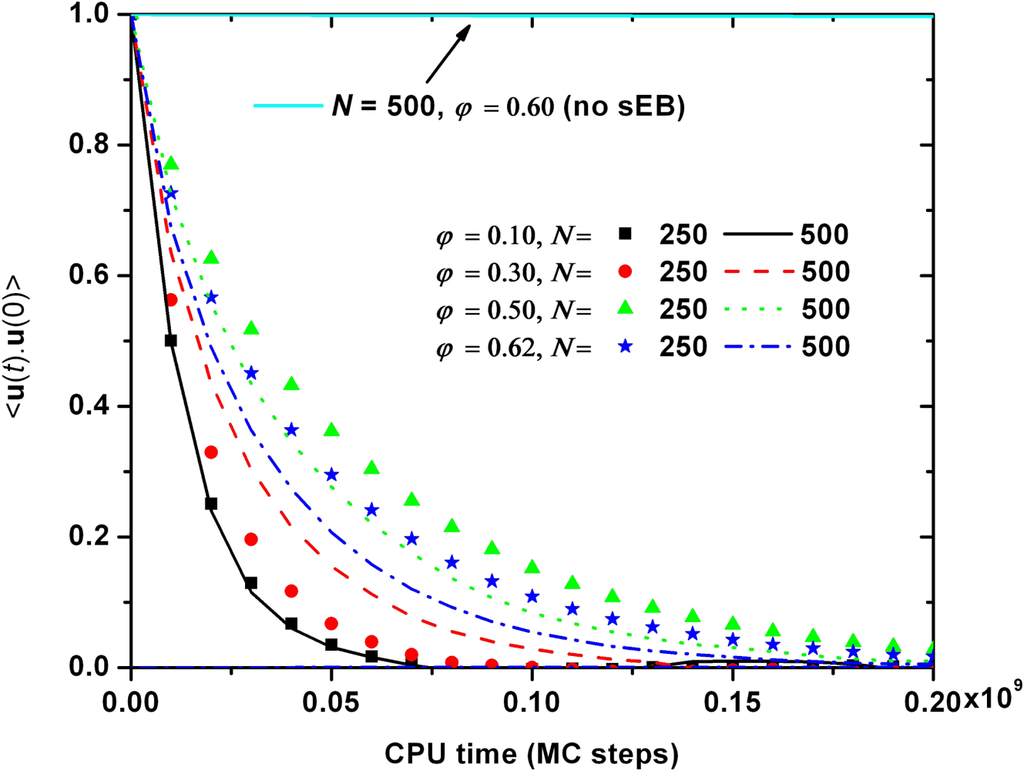 Orientational autocorrelation function of the end-to-end unit vector ⟨u(t) · u(0)⟩ as a function of CPU time (in MC steps) for the ⟨N⟩ = 250 and 500 systems at various packing densities φ. Also shown for comparison purposes is the corresponding curve from MC simulations with the original EB algorithm on the ⟨N⟩ = 500 system at φ = 0.60.