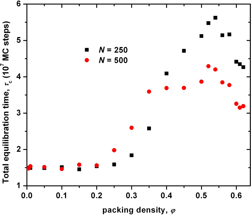 Total equilibration time τc, versus packing density φ, as obtained from MC simulations on the ⟨N⟩ = 250 and 500 systems. The corresponding equilibration time using the original EB algorithm for the ⟨N⟩ = 500 system at φ = 0.50 is approximately τc ≃2500 ×107 MC steps.