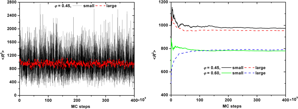 The evolution of the instantaneous value of the mean square end-to-end distance ⟨R2⟩ as a function of MC steps is shown in Figure 9a for the small and large systems at φ = 0.45 while Figure 9b shows the corresponding results for the running average of ⟨R2⟩ values at both densities. The calculated values are: (i) φ = 0.45: ⟨ R2⟩ = 967 (small) and 948 (large) with the relative error being less than 1.9% and (ii) φ = 0.60: ⟨R2⟩ = 778 (small) and 789 (large) with the relative error being less than 1.3%. Both relative errors are very low and definitely far below the statistical error in the calculation of the related quantity.