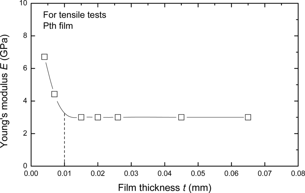 Following the linear elastic deformation, plastic flow commences at a stress approximately equal to the yield stress, σ 0.2, defined as the stress corresponding to a strain of 0.002. During plastic deformation, an evident strain-hardening is observed, that is, the stress required increases with the development of plastic strain. The maximum strength of a conducting polymer film is approximate to that of aluminum thin film when the thickness is smaller than about 10 μm. It can be seen from Figure 9 that the strengths of Pth films varied with the thickness. That is, the tensile strength increases as the Pth film thickness decreases. The strengths of films are especially sensitive to the film thickness when the latter is less than about 10 μm. However, the strengths of films approach a constant value when the film thickness is more than about 20 μm. Especially, an evident change has been observed in σ0.2 when the thickness is more than about 20 μm. A film with the thickness of 4 μm possesses the highest strength. This is because the thin film/coating early stage of deposited nucleation process is strongly influenced by substrate so that the thickness forms a correspondingly compact structure, but with the increasing of thickness, this influence becomes smaller and smaller. Therefore, the defects and cracks easily occur at the relative thicker film/coating layer. This insufficiency of defects and cracks in film/coating layer can be improved by the appropriate synthesis methods [,,,,,–].