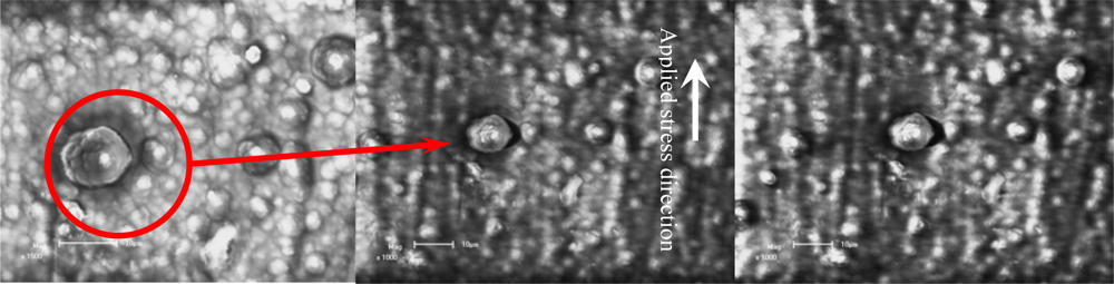 - The free surface cracking behavior of conducting polymer film/coating, taking into account the factors of temperature and holding time, can describe how cracks occur easily at the interface of greater agglomerated grains based on in situ SEM observations. The cracks’ main propagation direction is about 90° tilted to the mechanical loading direction. However, the increment of crack open displacement is about from 2.80 to 3.12 μm under a holding time 35 min at 100 °C. The effective difference of thermal distensibility between polymer and metal substrate on the crack proportion is still not obvious.