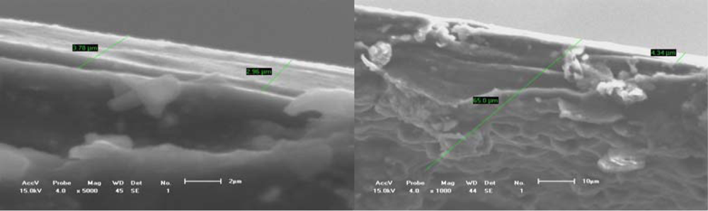The elastic (Young’s) modulus also varies pronouncedly with the thickness of film which is less than about 10 μm, but it approaches a constant when the thickness is more than about 10 μm. The relationship between elastic modulus and the thickness is shown in Figure 10. The main reason of this phenomenon seems to associate with the growth mechanism and its influence factors of the Pth films. When the thickness is less than 10 μm, the Pth mainly grows up in a stable manner on the base layer. But with increasing thickness, more and more agglomerated molecule groups are formed away from the base layer. Therefore, many micro-defects such as micro-cracks and micro-voids easily exist in the adjacent surface layer. At the same time, the binding energy of these agglomerated molecule groups becomes smaller and smaller because of the electrochemical influence or the influence of the metal substrate. Therefore, the microstructures of Pth films will change as the thickness increases. A thin film with the thickness of about 4 μm generally has a perfect microstructure with few defects.