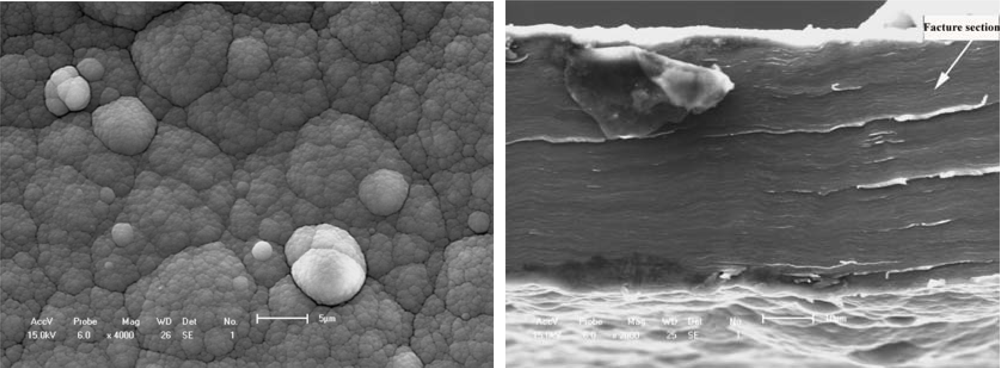 Figures 5 and 6 show the typical free surface morphology and cross-section fracture of conducting polymer films which were prepared in mixed electrolytes of IPA + 5% BFEE in an ice bath at 15 °C and 0 °C respectively. Figures 5a and 5b show the free surface and cross-section fracture of PPy film synthesized in an electrolyte of IPA + 5% BFEE + 5% PEG1000 at 15 °C, respectively. The results indicate that there are rather larger and flatter agglomerated groups and rather more grooves on the free surface, which forms a smooth cross-section surface of fracture as a result. The characterizations confirm the film has a poor toughness, whose elongation at break is about 4.47% and its tensile strength is about 36 MPa, as shown in Table 1. This is because the adhesion strength among the agglomerated groups is rather low. The surface cohesive force of this microstructure may be weaker than that of cap shape aggregation structure formed by capillarity or island microstructure formed by 3-D nucleation.