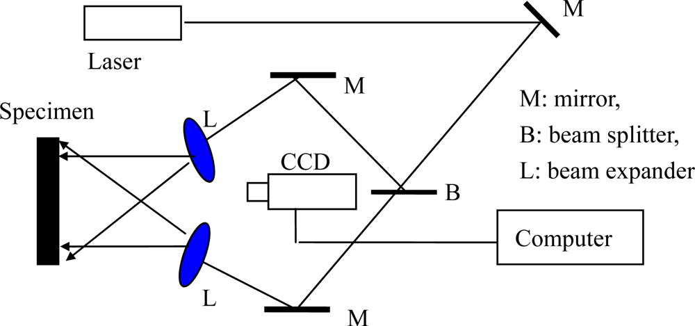 As another mechanical property parameter of conducting polymer film/coatings, the elastic modulus of the conduction polymer is very important in its applications, such as microelectronics, energy storage, electrocatalytic systems, photovoltaic devices, electrochromic devices, etc. In the case of conductive polymers potentially useful in electrical applications, the elastic modulus is a key mechanical parameter in the above mentioned applications. However the process of accurately measuring the mechanical parameters of a polymer is rather difficult. This is because how its constitutive stress-strain equation is obtained depends directly on its reliability, but the deformation of high flexibility films cannot be measured by the general methods. Wang et al. [,,,,,] used an electronic speckle pattern interferometry (ESPI) technology [,] and the digital image correlation (DIC) method [,], respectively, for measuring the deformation of highly flexible specimens of conducting polymer. Figure 7 shows a typical electronic speckle pattern interferometry system for measuring the in-plane displacement of a free surface by electronic speckle pattern interferometry (ESPI) technology. The laser beam is reflected from a mirror, and then split into two beams with a splitter. One is expanded by a spatial filtering setup and is used as the object beam illuminating a diffuse object; and the other is reflected from a mirror and is expanded by another spatial filtering setup, forming the reference beam. A zoom system is used to focus the object onto the sensor of a CCD camera. Thus, each sensor receives the coherent superposition of the object beam and the reference beam. The interference intensity distribution of a subtractive speckle correlation fringe pattern can be expressed by Equation (11):
