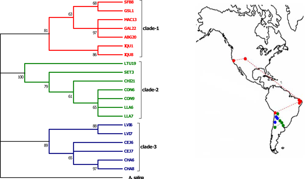 Consensus maximum parsimony phylogeny (50% majority rule of 124 most parsimonious trees, tree length = 230) of concatenated 16S and COI A. franciscana haplotypes. Values at nodes indicate bootstrap support based on 1000 pseudoreplicates. The geographic distribution of the recovered clades (connected by dashed lines for illustration purposes only) is shown on the map. The phylogeny is rooted with A. salina.