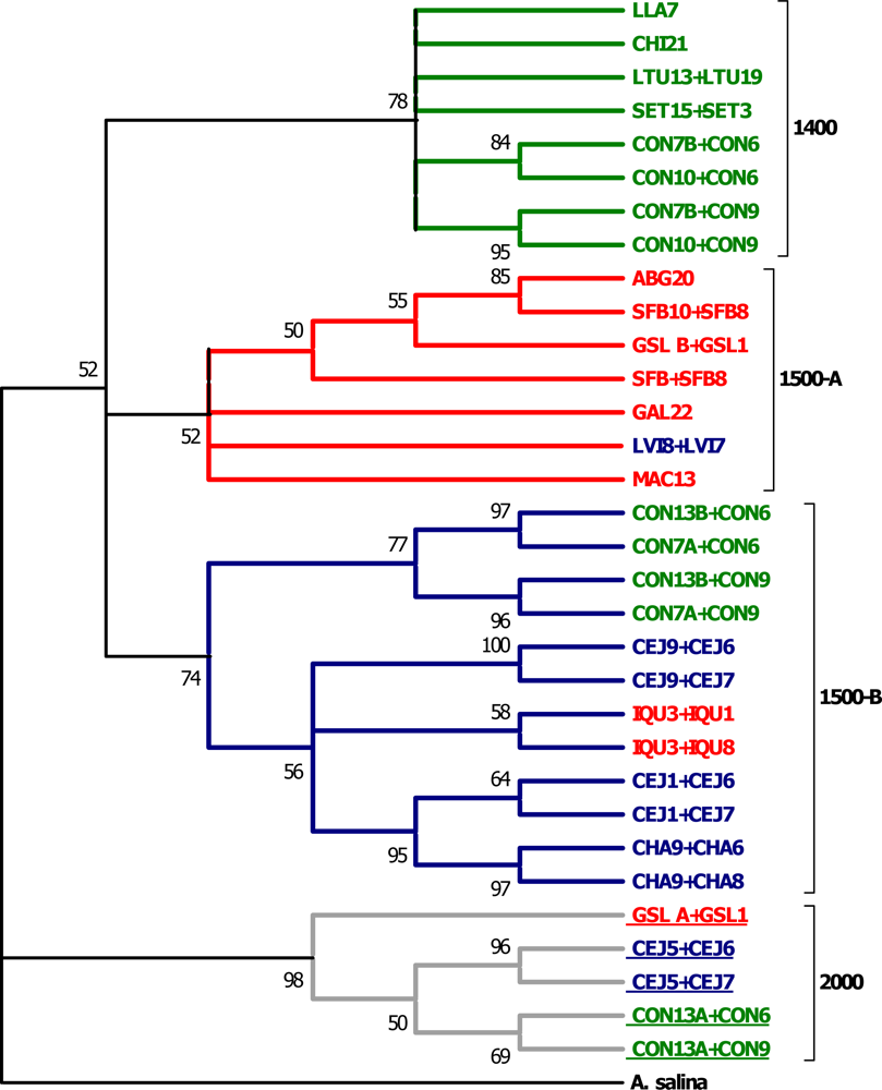 Consensus maximum parsimony phylogeny (50% majority rule of 38 most parsimonious trees, tree length = 1224) of concatenated p26 and ITS1 A. franciscana haplotypes. Values at nodes indicate bootstrap support based on 1000 pseudoreplicates. The order of concatenation is denoted as p26 + ITS1. Designations lacking a plus sign indicate concatenation of sequences from the same individual. The recovered groups (1400, 1500-A, 1500-B, 2000) are used as tags for the observed p26 alleles (see text). Colors (green, red, blue) correspond to the respective mitochondrial clades (see Figure 1). Haplotypes of the distinct 2000 group (gray) are underlined. The phylogeny is rooted with A. salina.