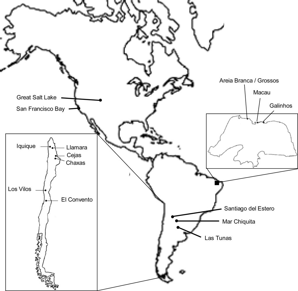 - Gajardo, GM; Sorgeloos, P; Beardmore, JA. Inland hypersaline lakes and the brine shrimp Artemia as simple models for biodiversity analysis at the population level. Saline Syst 2006, 2, 14. [Google Scholar]