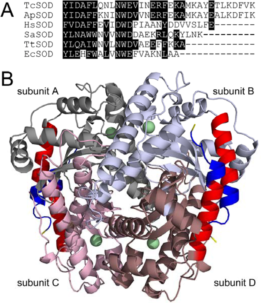 (A) Sequence alignment of the C-terminus of hyperthermophilic (TcSOD and ApSOD) and thermophilic/mesophilic (HsSOD, SaSOD and TtSOD) SODs. ApSOD, A. pyrophilus SOD; HsSOD, H. salinarum SOD; SaSOD, S. acidocaldarius SOD; TtSOD, T. thermophilus SOD; EcSOD, E. coli Fe-SOD. The residues with high homology were highlighted by black background. (B) Crystal structure of ApSOD (PDB ID 1COJ). The four subunits were drawn in different colors, and the C-terminal helix was presented in red. The last two turns of the C-terminal helix (residues from 202 to 210) were highlighted in blue, while K211 was in yellow.