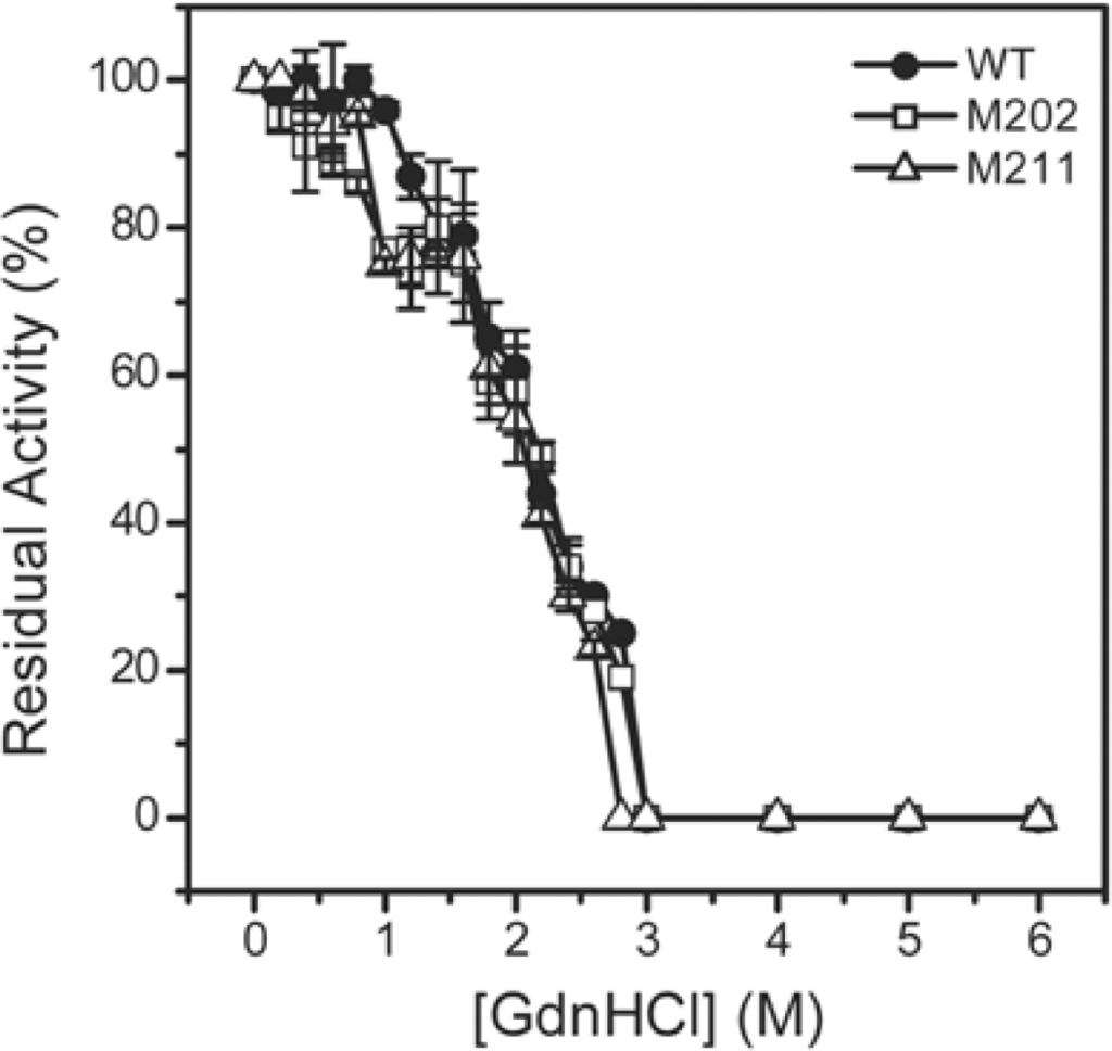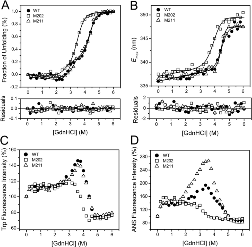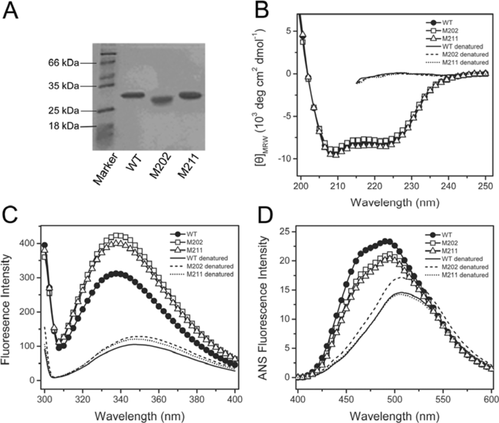 Characterization of the M211 and M202 mutants by SDS-PAGE (A), far-UV CD (B), intrinsic Trp fluorescence (C) and ANS fluorescence (D) spectra. The proteins were dissolved in 20 mM phosphate buffer, pH 7.4, with a final concentration of 0.27 mg/mL. The denatured samples were prepared by dissolving the enzymes in 20 mM phosphate buffer in the presence of 6 M GdnHCl for 12 h at 4 °C. The CD data were presented as the mean residue ellipticity ([θ]MRW). The intrinsic fluorescence was exited at 295 nm, and the ANS fluorescence was exited at 380 nm. All spectroscopic experiments were carried out at 25 °C.