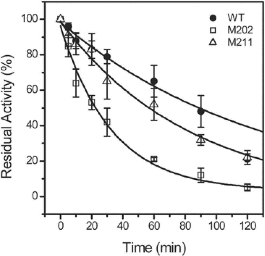 Thermal inactivation of the WT TcSOD, M202 and M211. The enzymes were dissolved in 20 mM phosphate buffer, pH 7.4, and heated at 95 °C. Aliquots of the enzyme solutions were taken at given time intervals, and then the residual activity was measured by the pyrogallol method at 25 °C. The final protein concentration was 0.27 mg/mL. The residual activity was normalized by taken the activity of the enzyme without heat-treatment as 100%. The data were fitted by the first-order kinetics, and the fitted data are presented as solid lines.