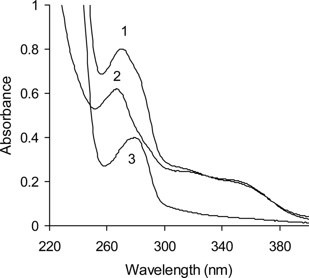 UV spectra of a red lentil acetonic extract and its fractions (1–extract; 2–fraction 1; and 3–fraction 2).