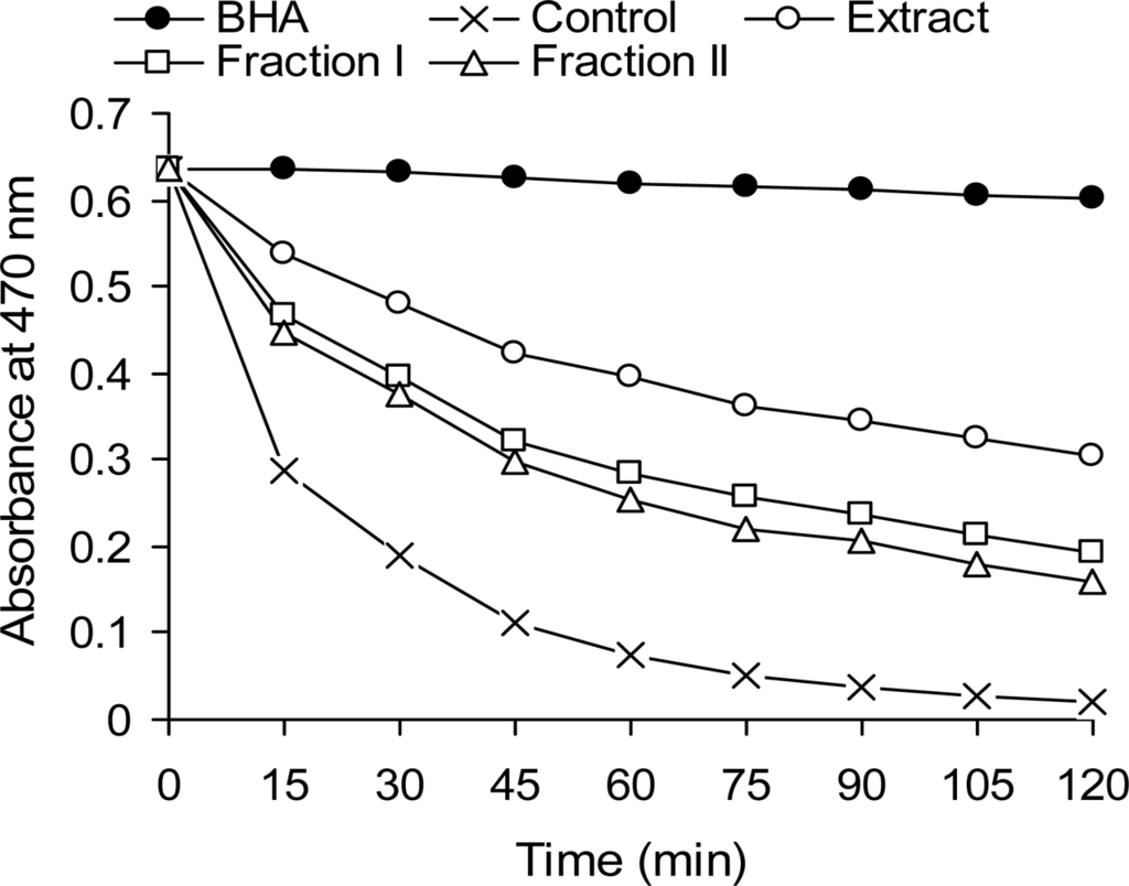 Antioxidant activity of a red lentil acetonic extract and its fractions in a β-carotene-linoleate model system, as measured by changes in absorbance at 470 nm.