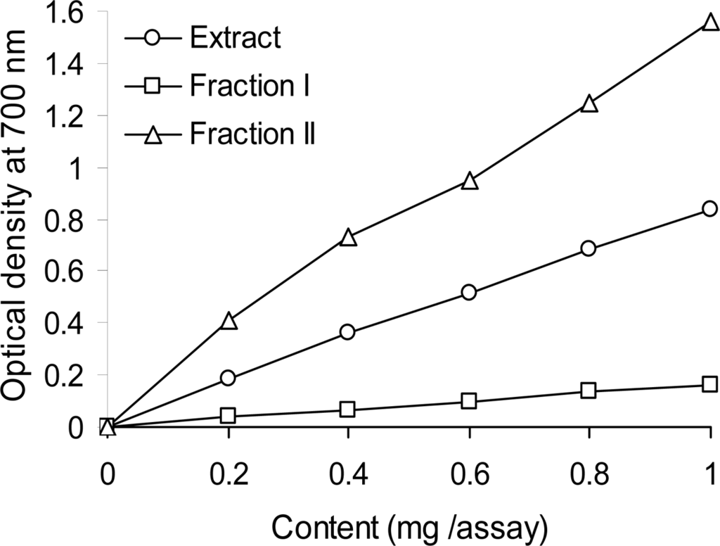 Reducing power of phenolics was determined as described by Oyaizu [30]. A suspension of the crude extract as well as fractions 1 and 2 in 1 mL of deionized water was mixed with 2.5 mL of 0.2 M phosphate buffer (pH 6.6) and 2.5 mL of 1% (w/v) potassium ferricyanide. The mixture was incubated at 50 °C for 20 min. Following this, 2.5 mL of 10% (w/v) trichloroacetic acid was added and the mixture was then centrifuged at 1750 × g for 10 min. A 2.5-mL aliquot of the upper layer was mixed with 2.5 mL of deionized water and 0.5 mL of 0.1% (w/v) FeCl3. The absorbance of the mixture was read at 700 nm with the spectrophotometer.