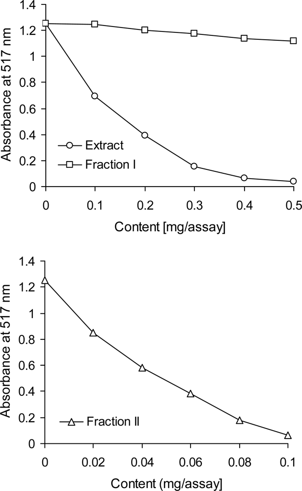 Scavenging effect of a red lentil acetonic extract and its fractions on the DPPH radical, as measured by changes in absorbance at 517 nm.
