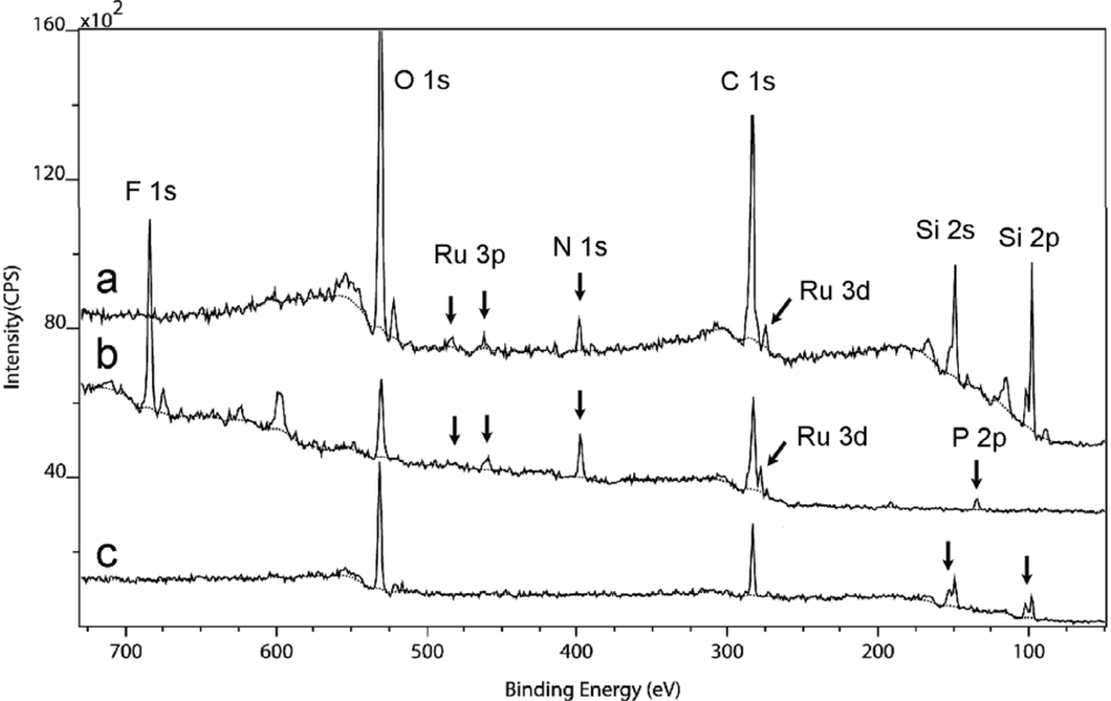 - Varughese, B; Chellamma, S; Lieberman, M. XPS study of self-assembly of ruthenium dimers [((acac)2Ru)2bptz]0,+ on hydrophobic and hydrophilic SAMs. Langmuir 2002, 18, 7964–7970. [Google Scholar]