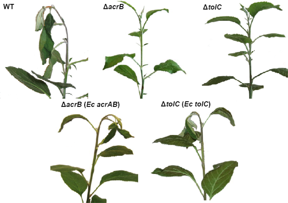 E. amylovora, a member of Enterobacteriaceae, is the causal agent of fire blight on apple and various other Rosaceae. Burse et al. [33] demonstrated that AcrB played an important role in virulence of E. amylovora and was required for resistance towards diverse plant phytoalexins as well as for successful colonization of the host plant. Recently, mutational analysis showed that TolC is also indispensable for virulence and bacterial in planta multiplication by mediating resistance towards phytoalexins through its exclusive interaction with AcrAB in E. amylovora [34].