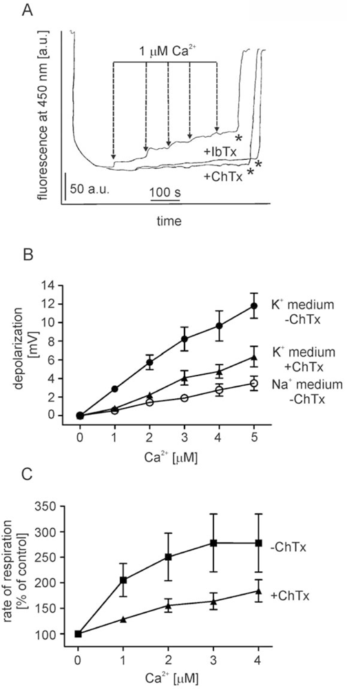 Effect of Ca2+ on the membrane potential of isolated brain mitochondria.(A) Original traces of mitochondrial membrane depolarization induced by Ca2+ in potassium medium (control), potassium medium supplemented with 50 nM IbTx and 200 nM ChTx. The mitochondrial membrane potential was measured by rhodamine 123 fluorescence at the concentration of 2.5 μM (as described in the Experimental section). The suspension of rat brain mitochondria was added into 1 mL of potassium medium with or without BK channel blockers; as respiratory substrates 5 mM malate and 10 mM glutamate were used. Complete membrane depolarization was reached by addition of 1.5 μM TTFB (indicated by *).(B) Quantitative changes of mitochondrial membrane potential after subsequent additions of calcium ions to mitochondria in potassium medium (filled circles), potassium medium supplemented with 200 nM charibdotoxin (filled triangles) and sodium medium (open circles). The experimental points are averages ±S.E.M of three independent experiments. The mitochondrial membrane potential was measured as described in the Experimental section.(C) Percentage of state 2 respiration stimulation of mitochondria by subsequent additions of CaCl2 into potassium containing medium, in the absence of BK channel inhibitors (filled squares) or in the presence of 200 nM ChTx (filled triangles). The mitochondrial respiration was measured as described in the Experimental section. The experiments are averages ±S.E.M of three independent experiments.