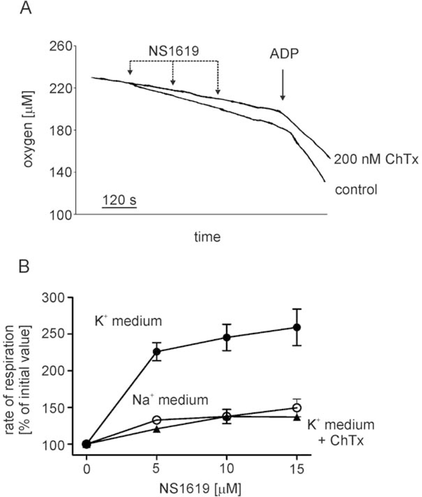 Potassium channel opener NS1619 induces charybdotoxin sensitive increase of rat brain mitochondria respiration.(A) Original oxygraph trace illustrating the effect of large conductance potassium channel opener NS1619 on the rate of respiration of mitochondria isolated from rat brain. Additions: NS1619 – 5 μM, ChTx – 200 nM, ADP – 100 μM.(B) Percentage of stimulation of mitochondrial state 2 respiration by subsequent additions of NS1619 in potassium – containing medium (filled circles), sodium – containing medium (open circles) and potassium –containing medium supplemented with 200 nM ChTx (filled triangles). The experimental points are average ±S.E.M of three independent experiments.
