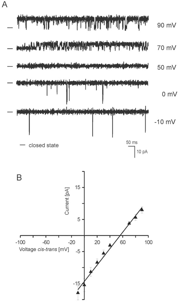 Preparations of inner mitochondrial membrane particles (SMP) from rat brain were reconstituted into black lipid membranes and the current characteristics of ion channels were observed. The fusion of SMP to the bilayer was usually observed within 15–30 min after addition to the trans compartment. Original single channel recordings in gradient 50/450 mM KCl (cis/trans) solution at different voltages are shown in Figure 3A. Figure 3B shows the current-voltage relationships for single channel opening at different voltages under gradient conditions. The channel conductance was 265 ± 5 pS under gradient conditions. The reversal potential measured in the gradient 50/450 mM KCl (cis/trans) solution is equal to 50 mV and this proves that the examined channel is cation-selective (Figure 4A). The mean reversal potential calculated after fitting to experimental data is equal to 52 ± 4 mV. The distribution of open and closed dwell-time was also analyzed. The open dwell-times at 90 mV and −10 mV is equal to approximately 10 ms and 1 ms, respectively; as well as closed dwell-times at 90 mV and −10 mV are equal to approximately 1 ms and 602 ms, respectively. This means that the channel at gradient conditions over reversal potential was mainly open and at negative holding potential was practically closed.