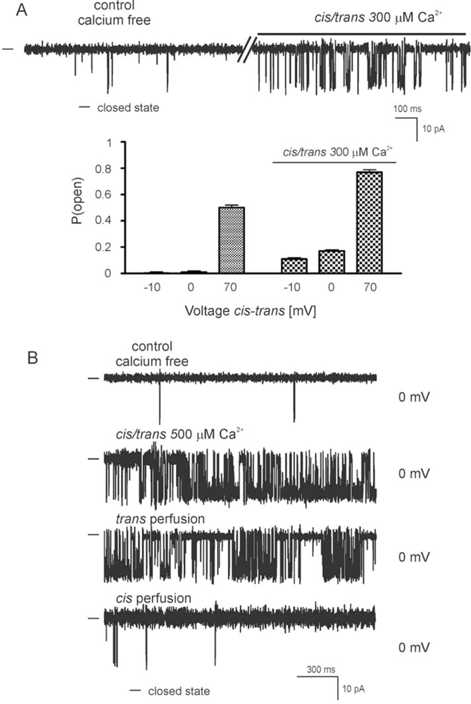 Ca2+ effects on the activity of the mitoBKCa channel.(A) Single channel recordings in gradient 50/450 mM KCl (cis/trans) solution at 0 mV under calcium free control conditions and after addition of 300 μM Ca2+ (cis/trans). – indicates the closed state of the channel. Recordings were low pass filtered at 1 kHz. Lower panel: P(open) value at different voltages under calcium free control conditions and after addition of 300 μM Ca2+ (cis/trans). (B) Single channel recordings in gradient 50/450 mM KCl (cis/trans) solution at 0 mV under calcium free control conditions, after addition of 500 μM Ca2+ (cis/trans), and after perfusion: first trans side and next cis side. – indicates the closed state of the channel. All recordings were low pass filtered at 1 kHz.