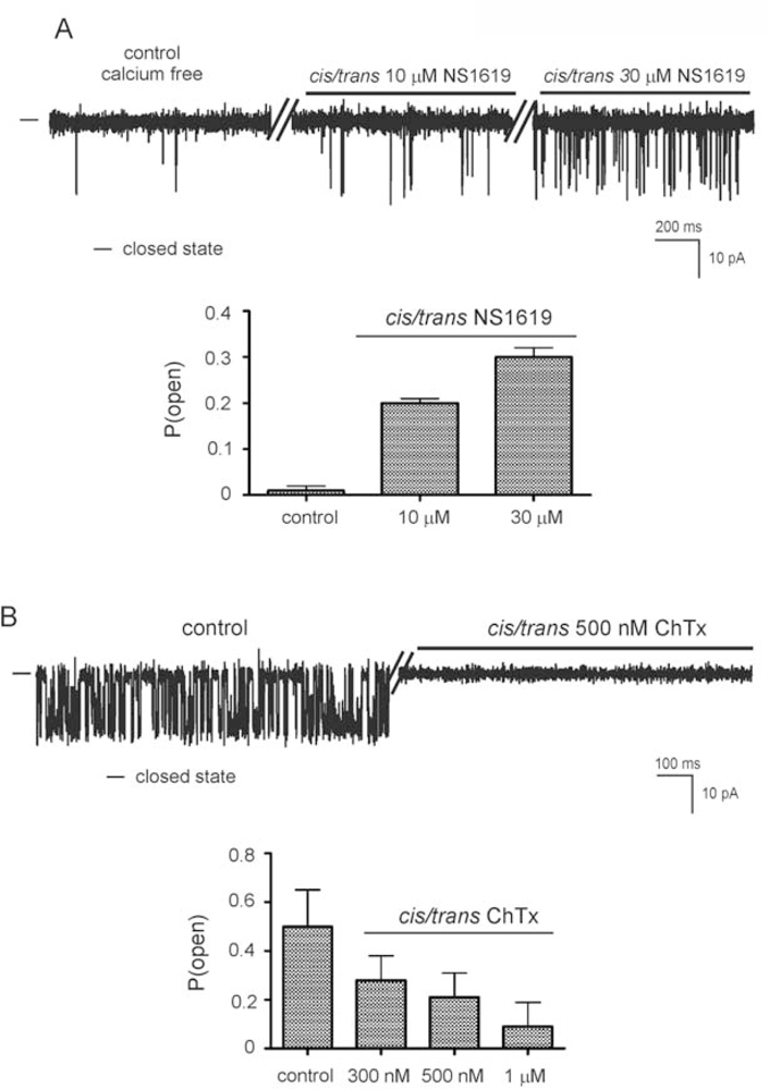 The potassium channel opener NS1619 known to modulate the mitoBKCa channel activity was used to alter the ion channel properties observed in our experiments. Figure 5A shows single channel recordings in gradient 50/450 mM KCl (cis/trans) solution at 0 mV under calcium nominally free control condition and after addition of 10 μM or 30 μM NS1619 (cis/trans). The probability of opening of the ion channel increased from 0.01 ± 0.01 to 0.30 ± 0.02 in presence of 30 μM NS1619 in cis/trans compartments.