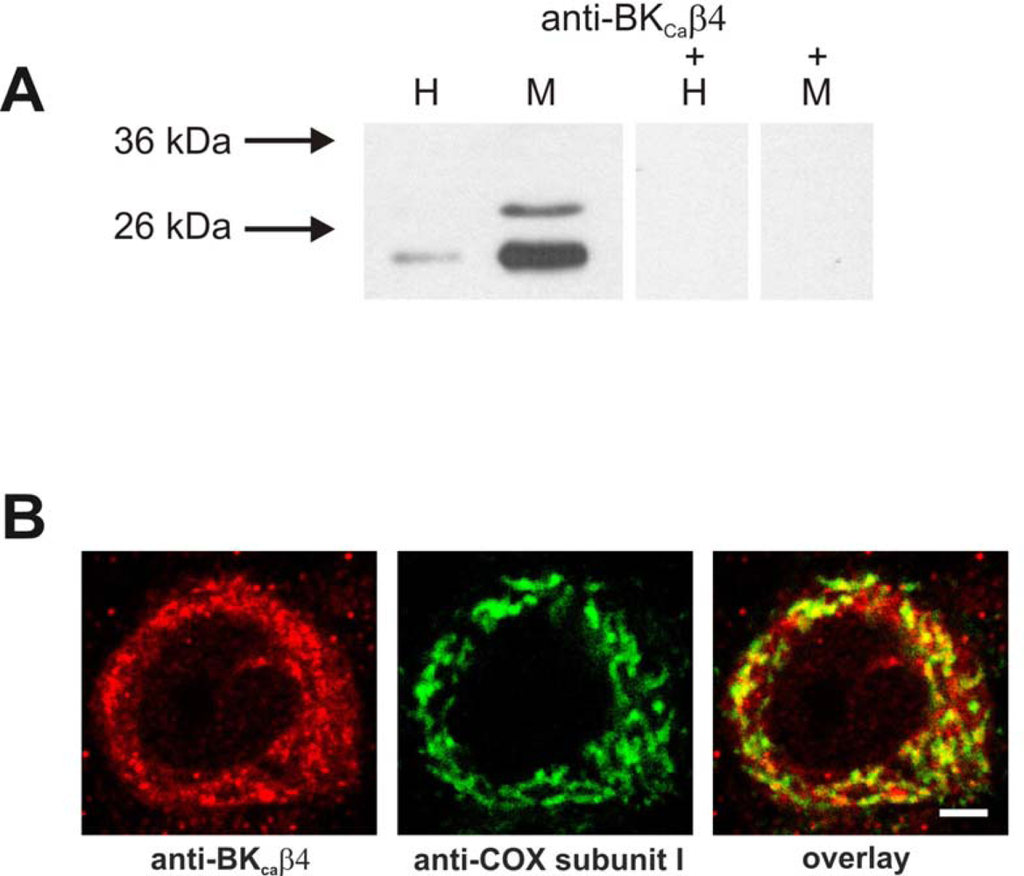 Immunodetection of BKCa β4 subunit in rat brain mitochondria.(A) Western blot detection of BKCa β4 subunit in rat brain mitochondria. Immunoblot analysis of homogenate (H) and mitochondrial fraction (M) of rat brain revealed the presence of BKCaβ4 – immunoreactive product of approximately 26 kDa in mitochondria. The immunoreaction was displaced with an antigen peptide (M+).(B) Mitochondrial localization of BKCa β4 subunit in rat hippocampal neurons.High power confocal image of neuron in rat hippocampal CA1 region immunolabeled for the BKCa β4 subunit (red) and the mitochondrial marker COX subunit I (green). The yellow color in the overlay indicates colocalization. Scale bar = 3 μm.