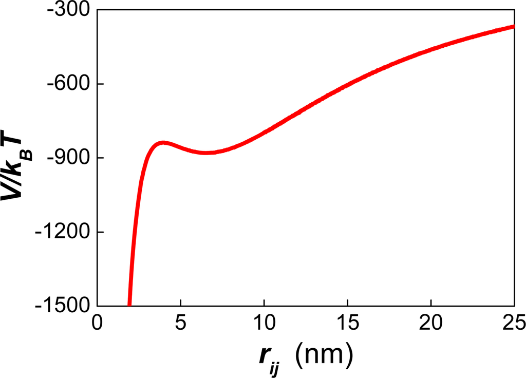 Classical DLVO potential. The curve corresponds to the interaction potential between two 3.9-μm drops of dodecane (AH = 5.03 × 10−21 J) suspended in water. The drops are partially covered with sodium dodecyl sulfate (Cs = 10−4 M, zs = −0.2057) using a homogeneous surfactant distribution (Section 3).