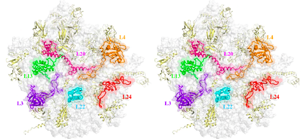 29]. This study indicates that the two centres assemble independently of each other around protein L24 and L3. Then five primary binding proteins L3, L4, L20, L22 and L24 play an essential role on the assembly of the first reconstitution intermediate. The three dimensional structures of the ribosomal particles [