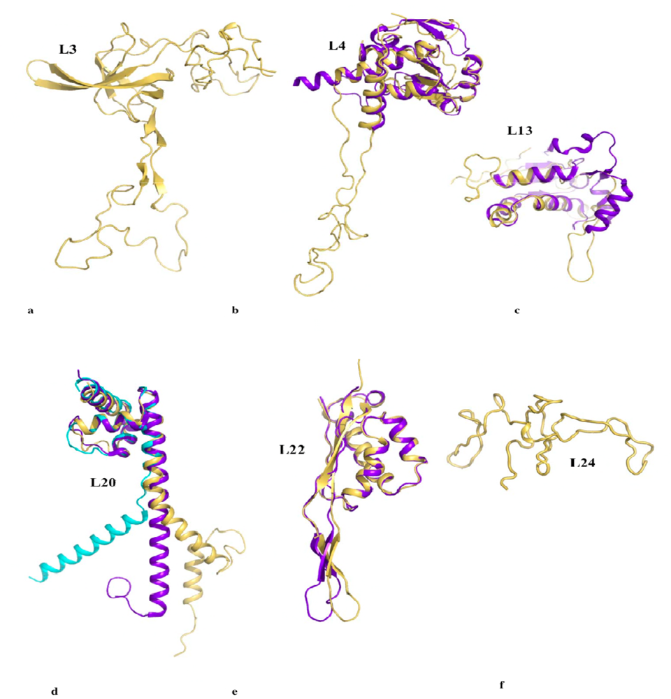 Figure 2 compares the structures of the six proteins L3, L4, L13, L20, L22 and L24 that are essential for the early steps of the 50 S particle assembly. When available, the coordinates of the structures of the free forms are superimposed on the forms bound to the 23 S RNA within the the 50 S subunit of