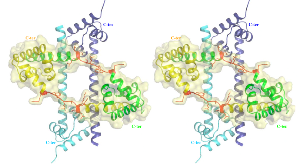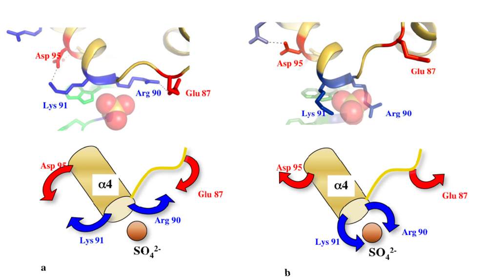 Two transient salt bridges that involve two conserved basic amino acids (arg 90 and lys 91 in N-ter of α4) at the interface of the two domains “stabilize” the partially unfolded form. Indeed, their formation seems to be related with the partial unfolding of the extension. The disruption of these salt bridges upon complete protein folding generates a dramatic reorganisation of the surface electrostatic potential (