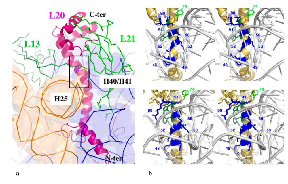 15]. While its globular C-ter domain interacts with L21 and L13 at the surface of the ribosome, its long α-helical extension seals the approach of two domains of the 23 S RNA. The charged side chains of the cluster of the basic residues interact with the phosphate groups of the H40/41 helix backbone (
