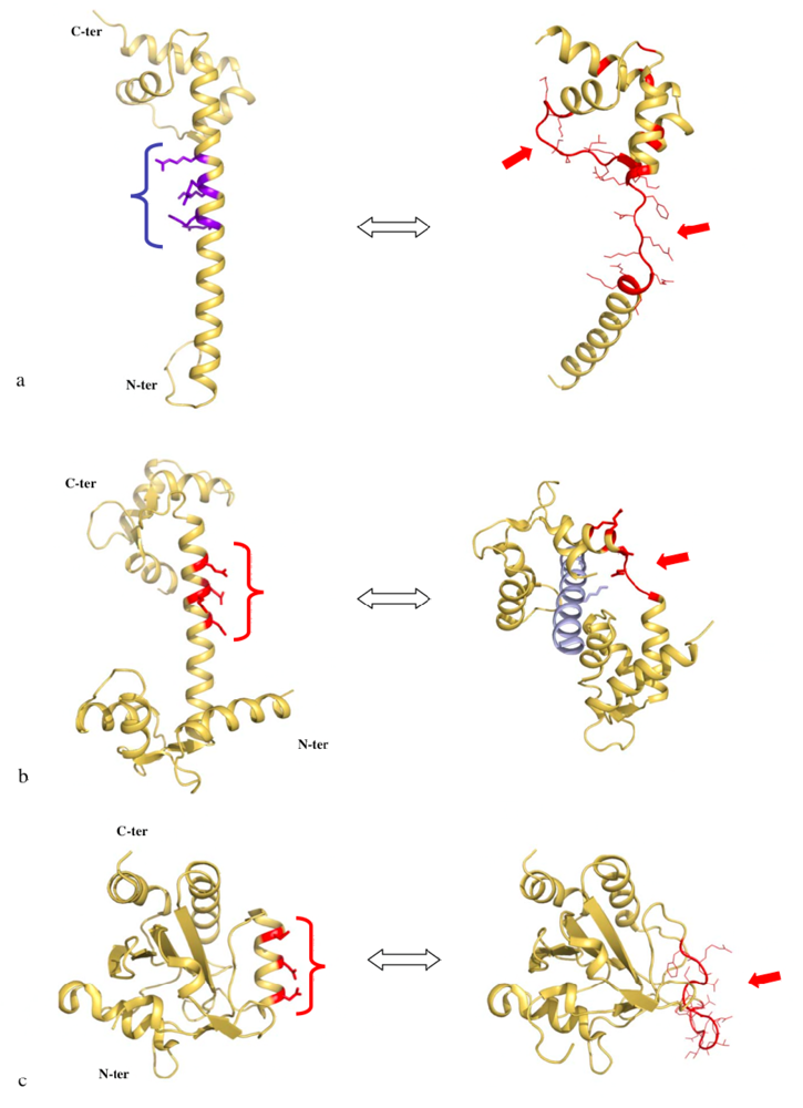 Figure 6a, left). Therefore, electrostatic repulsion between the positively charged side chains is likely responsible for the instability of this helical segment. Indeed, the spatial arrangement of the side chains along the same side of three α-helix turns generates a very high density of positive charges. A similar organisation of negatively charged residues is found in the α-helical linker of calmodulin [
