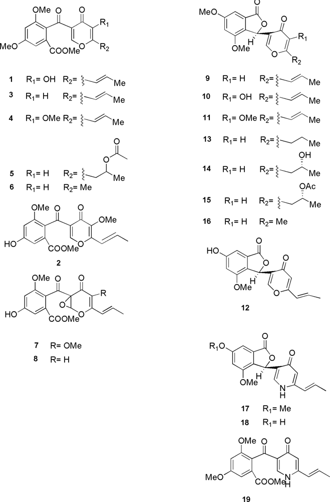 The structures of funicone-related compounds (Figure 1) are based on a γ-pyrone ring which is linked through a keto function to a β-resorcylic acid nucleus whose carboxylic group is esterified by methanol; depending on the specific metabolite, one or more hydroxyl groups may be methylated, while several substitutions occur at the carbon atoms of the γ-pyrone nucleus. The parent molecule of the series is funicone (1) [benzoic acid, 2-[[5-hydroxy-4-oxo-6-(1E)-1-propenyl-4H-pyran-3-yl]carbonyl]-3,5-dimethoxy, methyl ester] [1], which was named after the Latin name of the producing organism, Penicillium funiculosum, a species belonging to the subgenus Biverticillium [2]. However, considering its description and morphological appearance [3], the producing strain should probably be more correctly ascribed to Penicillium pinophilum, a species that was later neotipified and separated by P. funiculosum [4]. The compound has been more recently detected in a strain of Talaromyces flavus [5], an ascomycetous mycoparasite (Eurotiomycetes, Eurotiales) whose anamorphic state (Penicillium dangeardii, syn. P. vermiculatum) is taxonomically closely related to species in the subgenus Biverticillium, and in Penicillium simplicissimum (subgenus Furcatum) [6].