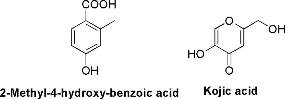 Merlini et al. [1] consider biosynthesis of funicone to occur following a polyketide pathway through a hypothetical tricyclic intermediate. This opinion is shared for the formation of deoxyfunicone [8] and rapicone [13], in the latter case by considering analogies with other fungal heptaketides. Actually, the presence in the culture filtrates of different strains of T. flavus of other polyketides possibly sharing part of a common biosynthetic pathway, such as vermiculin, vermiculinic acid and compound NG-012 [10,23], corroborates this assumption. However, the finding of 2-methyl-4-hydroxybenzoic acid (Figure 2), particularly abundant in the mycelial cake developed in liquid cultures of P. pinophilum, has stimulated a hypothesis that 3-O-methylfunicone could rather be directly assembled by two molecules of such compound undergoing oxidation [24]. Reactions carried out in artificial conditions [25] indicate that another possible precursor involved in the biosynthesis of the γ-pyrone moiety of funicones is kojic acid (Figure 2), a compound that is also reported as a fungal extrolite, particularly in Penicillium and Aspergillus species [26,27].