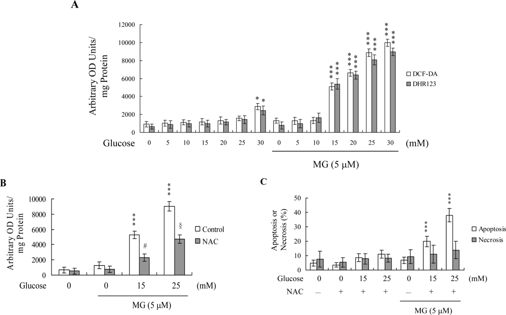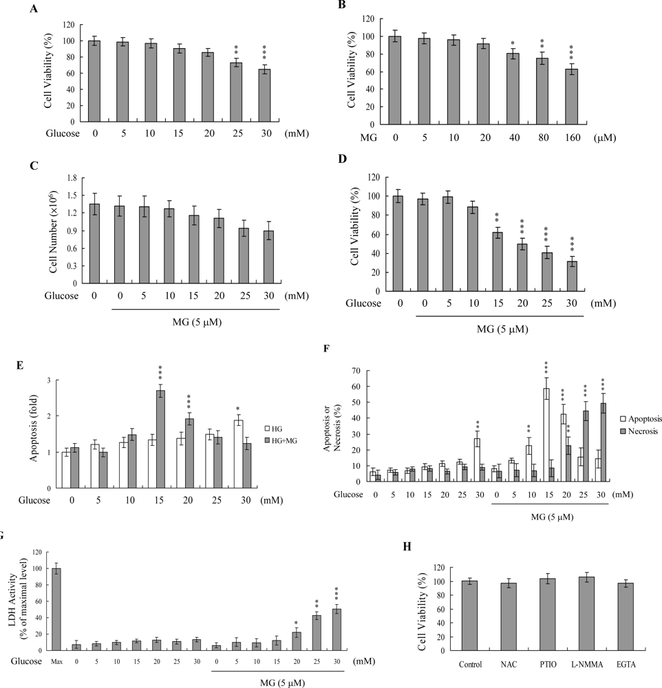 - Chan, WH; Wu, HJ. Methylglyoxal and high glucose co-treatment induces apoptosis or necrosis in human umbilical vein endothelial cells. J. Cell. Biochem 2008, 103, 1144–1157. [Google Scholar]
