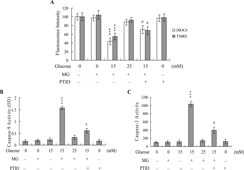- Ho, FM; Liu, SH; Liau, CS; Huang, PJ; Lin-Shiau, SY. High glucose-induced apoptosis in human endothelial cells is mediated by sequential activations of c-Jun NH(2)-terminal kinase and caspase-3. Circulation 2000, 101, 2618–2624. [Google Scholar]