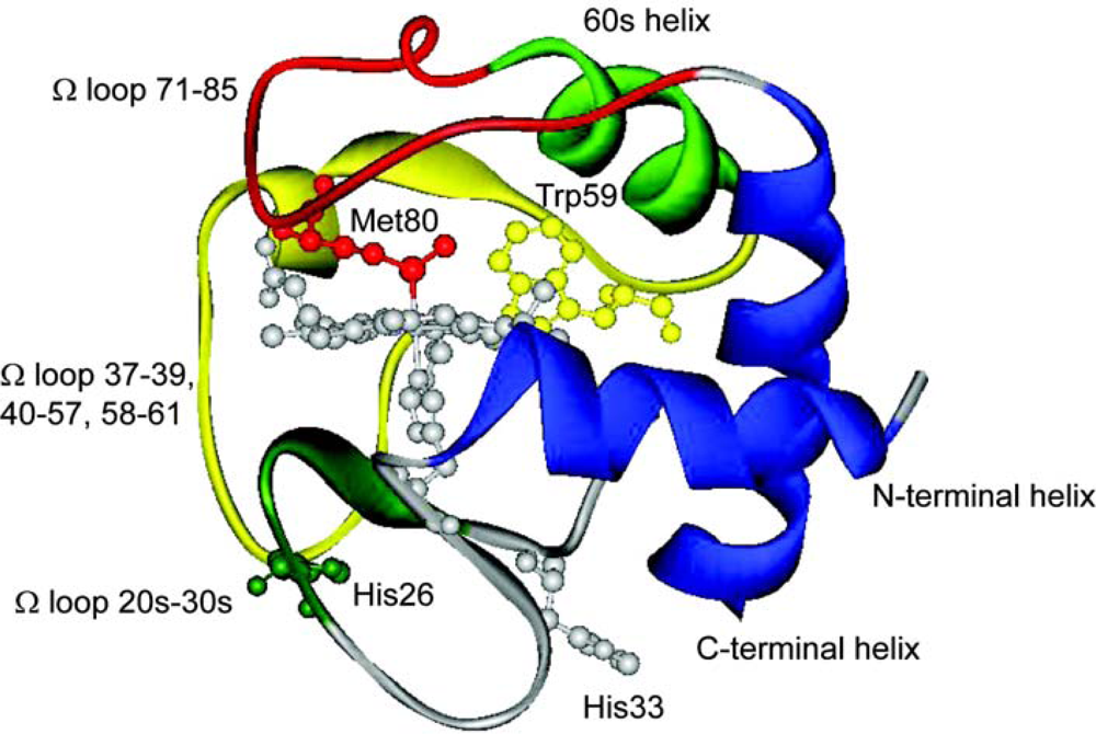 Drawing of the native structure of horse heart cytochrome c showing the heme coordinated by His18 and Met80, the locations of His26 and His33 (which can bind to heme under denaturing conditions), and Trp59 (PDB 1hrc). The foldons, discrete units of secondary and tertiary structure that unfold sequentially in the order red, yellow, green, and blue, are shown as identified by Bai et al. [] (see text).