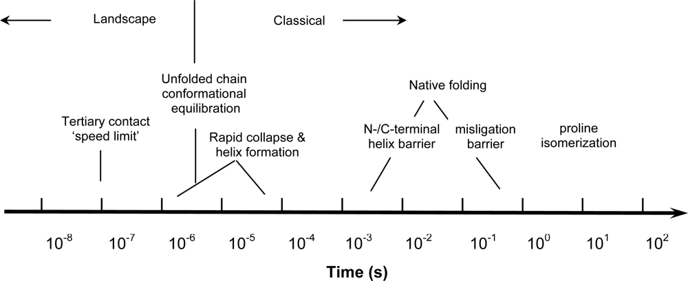 The observed folding dynamics can extend from the hundreds of nanoseconds timescale for initial helix formation [], through the millisecond acquisition of essentially native secondary and tertiary structure, to the final isomerization of proline bonds on the timescale of seconds (Figure 2) []. The folding kinetics of cyt c over this ~ 8 orders of magnitude in time can depend qualitatively (number of intermediate states) and quantitatively (rate constants) on the ligation state of the heme (e.g., complexation with exogenous ligands) and on its oxidation state, as well as on the denaturant concentration, pH, and temperature []. The result has been a rich array of studies as the folding kinetics of cyt c are explored with various combinations of protein and solvent conditions, spectroscopic probes and degrees of time resolution. We review here many of these kinetic studies with a particular eye to the earliest processes, i.e. those on the nanosecond to microsecond timescales, which have become increasingly accessible to experiment over the past ~ 15 years. The existence and nature of these intermediates have been the subject of considerable controversy. We also discuss their import to understanding the cooperative mechanism leading to the appearance of the native fold on the 1 ms and longer timescales. We first briefly survey the kinetics of the late folding processes in cyt c in order to set the context before considering the beginning of the folding reaction coordinate and the first dynamic events arising from the unfolded state. The reader is also referred to the earlier review by Winkler, which provides a somewhat broader survey of experimental and theoretical results for cyt c folding dynamics [].