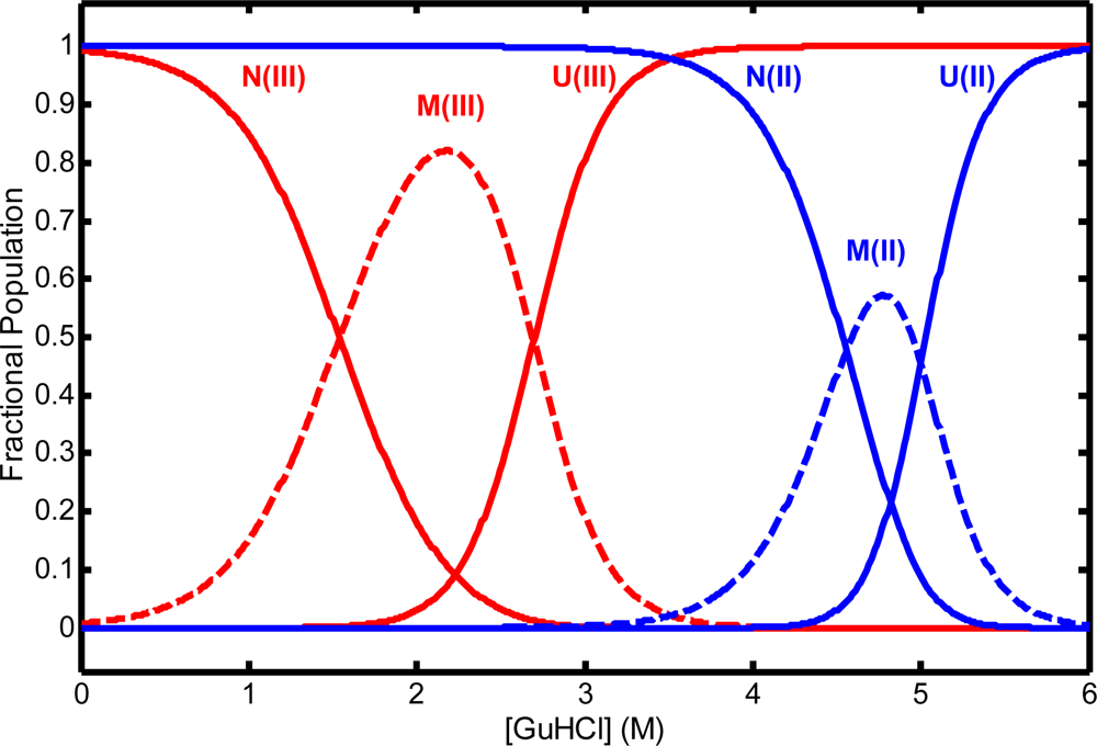 Equilibrium populations of native (N), molten globule (M), and unfolded (U) states of FeII (blue lines) and FeIII (red lines) cyt c vs. GuHCl concentration, calculated from the thermodynamic data of Thomas et al., pH 6.5, 40 °C [].