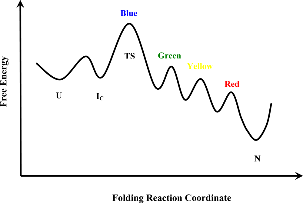 Schematic of a possible cytochrome c folding pathway U ⇔ IC → N shown as free energy vs. reaction coordinate. The equilibrium observed for the first step implies that IC lies within ~ kBT in free energy from U. Formation of the (Blue) N-/C-terminal helix foldon is the rate-limiting barrier to folding (TS). After passage over TS, the remaining foldons (Green, Yellow, and Red) are formed very rapidly through a sequence of ephemeral intermediates leading to N. (For simplicity, the foldon labels are shown by the respective energy barriers leading to their formation.).