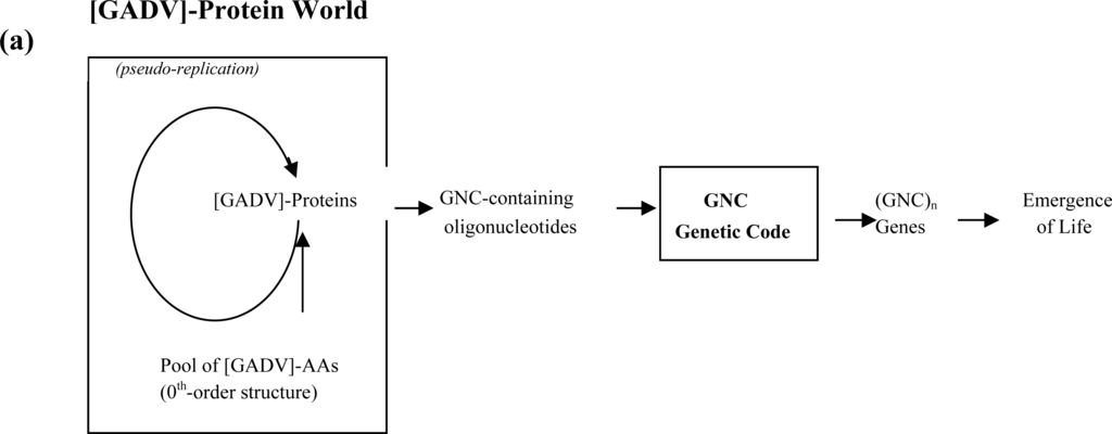 The notion of the protein 0th-order structure led us to a new concept, assuming that water-soluble globular [GADV]-proteins could be created by random polymerization of [GADV]-amino acids with a high probability, even in the absence of any genetic function, i.e., before the creation of the first gene. This is because individual [GADV]-amino acids are functional units for protein structure formation, and [GADV]-amino acids satisfy the four conditions for formation of water-soluble globular proteins [20]. Previous experimental results showed that [GADV]-peptides have protease activities, implying that [GADV]-peptides carry catalytic activity for peptide bond formation through micro-reversibility of catalysts [23]. This suggests that [GADV]-proteins could be pseudo-replicated even before creation of the first (GNC)n gene, due to the simple amino acid composition and high activities catalyzing peptide bond formation of the proteins. Pseudo-replication is a process where proteins comprising the same constituent set of amino acids (composition), which possess similar but different structures, are generated by a random process without resorting to any exact duplication.