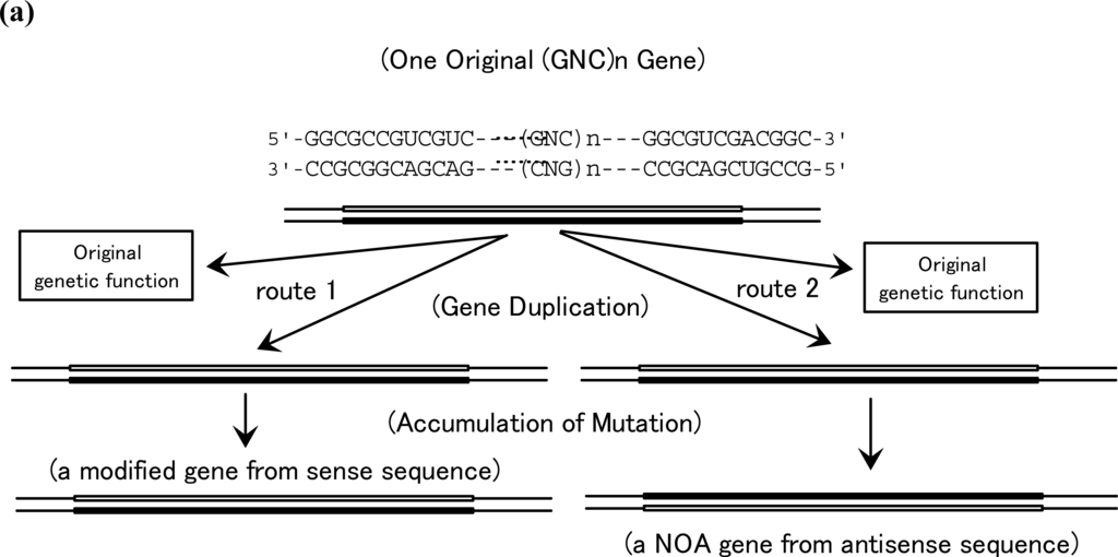 The first gene must have been a single-stranded (GNC)n gene, since genetic information must be composed of only GNC codons under GNC primeval genetic code. Subsequently, the first double-stranded (GNC)n gene was produced by synthesis of complementary strand of a single-stranded (GNC)n gene. Of course, base compositions at three positions within each codon on the sense strands are similar to those on the corresponding anti-sense strands. Presumably, GNC codon sequences on anti-sense strands were utilized as genes encoding NOA proteins, which were the first proteins in protein families. GNC codon sequences on antisense strands are quite different from sense sequences so that can be regarded as random arrangement of GNC codons [31] [Figure 7 (a)]. This implies that sense sequences were utilized for encoding not the same but similar information for homologous proteins in a protein family, as proposed by Ohno [route 1, Figure 7 (a)] [32], while anti-sense sequences produced as part of the consequence of gene duplication gave an opportunity for creation of NOA proteins that are quite different from all existing proteins [route 2, Figure 7 (a)] [18].