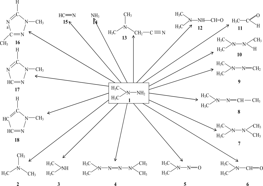 In the present review the application of QSAR/QSPR methodologies to investigation the environmental and human health impact of residual rocket fuel, 1,1-dimethylhydrazine (1), as well as a series of its transformation products will be used as an illustrative example [4–6]. This example further constitutes an illustration of the above mentioned problem associated with primary and secondary pollutants.