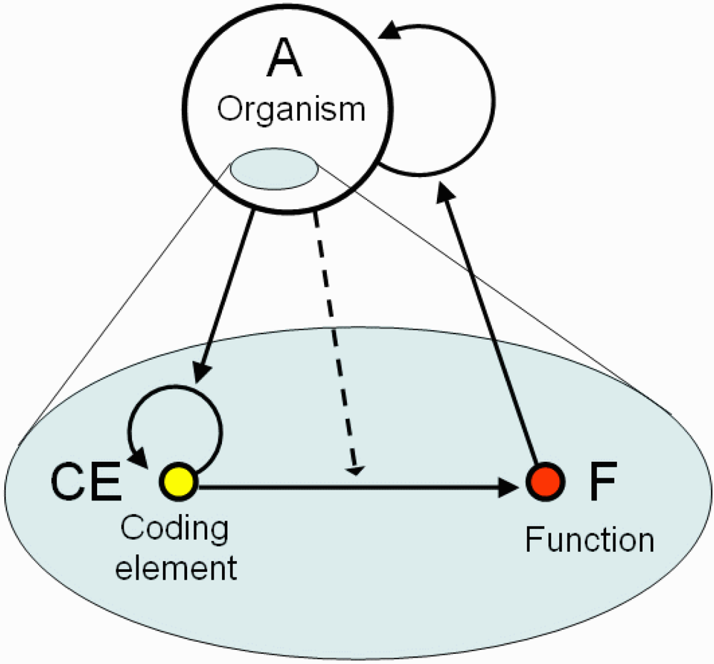 Components of the coding relation. Coding element, CE, encodes function, F, which enhances survival and reproduction of organism, A; autocatalysis of CE is mediated by A.