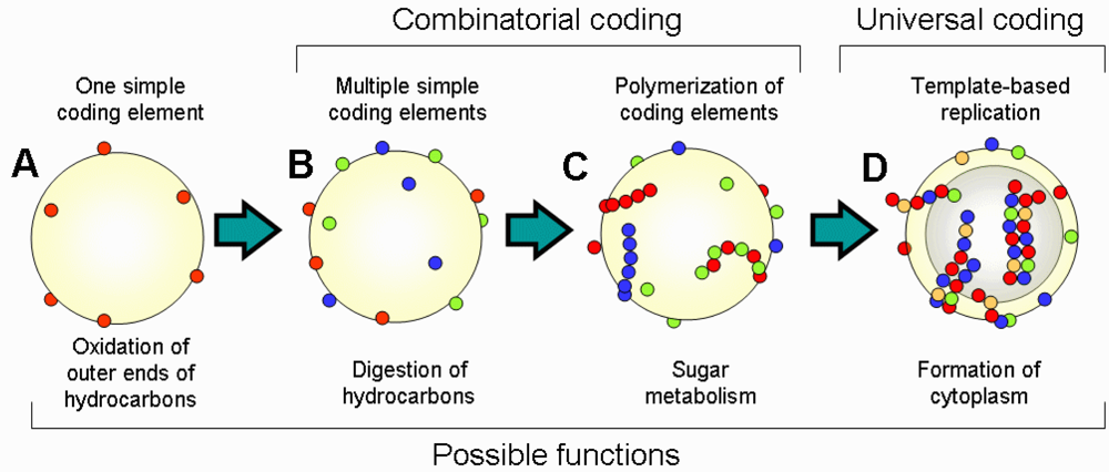 Early steps of biological evolution: (A) single coding elements; (B) multiple coding elements (combinatorial coding); (C) polymerization of coding elements (repetitive or random); and (D) template-based replication.