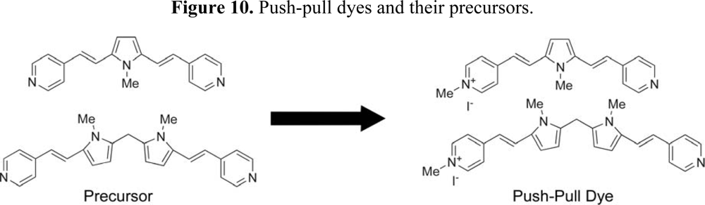 In the cases of nonlinear optical (NLO) and electro-optic (EO) materials, many molecular design strategies and assembly methods have been devised to achieve polar order of the molecular building blocks on various substrates and within matrices. For example, Langmuir-Blodgett (LB) film transfer, polymer/sol-gel electric field poling, head-to-tail H-bonding, crystal engineering and molecular self-assembly are among the most preferred methods. Among the various approaches to preparing suitable electro-optic materials, layer-by-layer molecular self-assembly, and templated formation of intrinsically polar chromophores, grown directly on silicon or related substrates, is fascinating. Active second-order NLO chromophores must have an asymmetric charge distribution, however symmetrical charge distributions usually enhance third-order NLO response. The key importance of local dipole contributions to the resulting molecular hyperpolarizability of di/multibranched chromophores has been studied theoretically and experimentally.[] Recently, Marks and Facchetti and co-workers have demonstrated that layer-by-layer self-assembled heterocycle-based dyes composed of both π-excessive (pyrrole, indole, thiophene) and pi-deficient (pyridine, diazines, quinoline, isoquinoline) heteroaromatics afford new chromophore families exhibiting both second- and third-order response.[] The combination of a pyridinium salt and a pyrrol-2-yl substituent results in highly effective “push-pull” systems. Furthermore, they have reported the synthesis and physicochemical properties of new heterocycle-based push-pull chromophore systems (Figure 10). Chromophore precursors and the corresponding N-monomethyl salts undergo chemisorptive reaction with indobenzyl functionalized surfaces to afford chromophore monolayers. Spin-coating of the chromophore precursors on a benzyl-halide functionalized substrate-surface followed by a vacuum oven treatment results in films with far larger NLO responses (up to 1 order of magnitude) than films prepared by a stepwise solution-based assembly process. The second-order NLO response depends substantially on differences in film microstructures and π-electron distributions. These self-assembled chromophoric films therefore exhibit complementary nonlinear optical properties and have potential for NLO/EO applications.